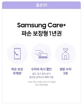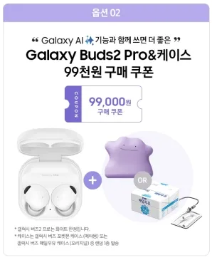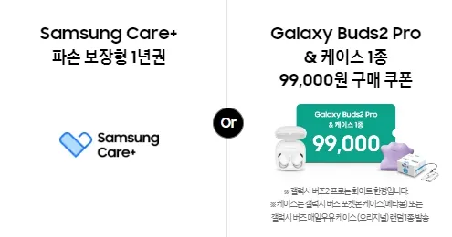 삼성케어는 파손 보장형 1년권입니다. 쿠폰은 갤럭시 버즈2 프로와 케이스 1종을 99,000원에 구매할 수 있는 쿠폰이 제공됩니다.