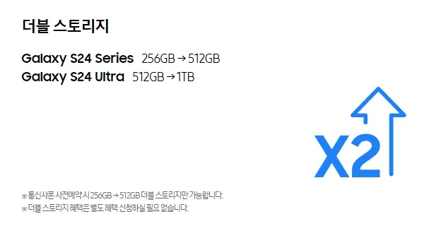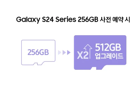 Galaxy S24 시리즈는 256GB를 512GB로, Galaxy S24 Ultra의 경우에는 512GB를 1TB로 업그레이드 해드립니다.