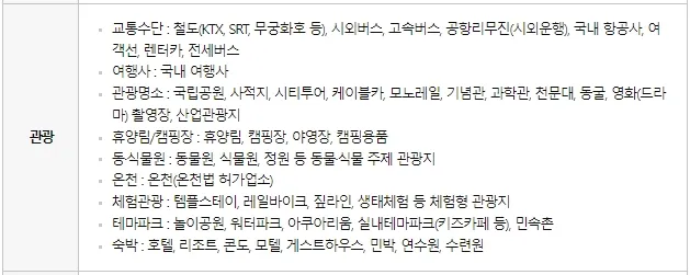 KTX나 SRT, 무궁화호 등 철도와 시외버스, 고속버스, 공항리무진, 국내 항공사와 국내 여행사 이용 시에 사용하실 수 있습니다.