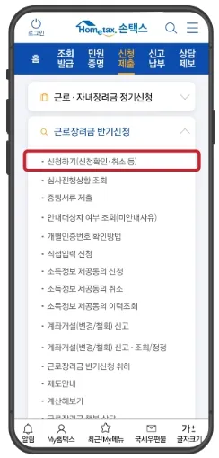 국세청 홈택스 로그인 > 세무업무별 서비스 > 근로, 자녀장려금 > 반기신청 > 신청하기