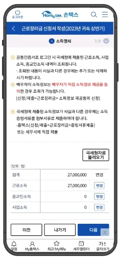 신청/제출 > 근로장려금 반기신청 > 신청하기 > 로그인하여 신청 > 인적, 가구사항 > 소득명세 작성 > 전세금 명세 > 계좌번호 작성 > 신청확인 및 전송